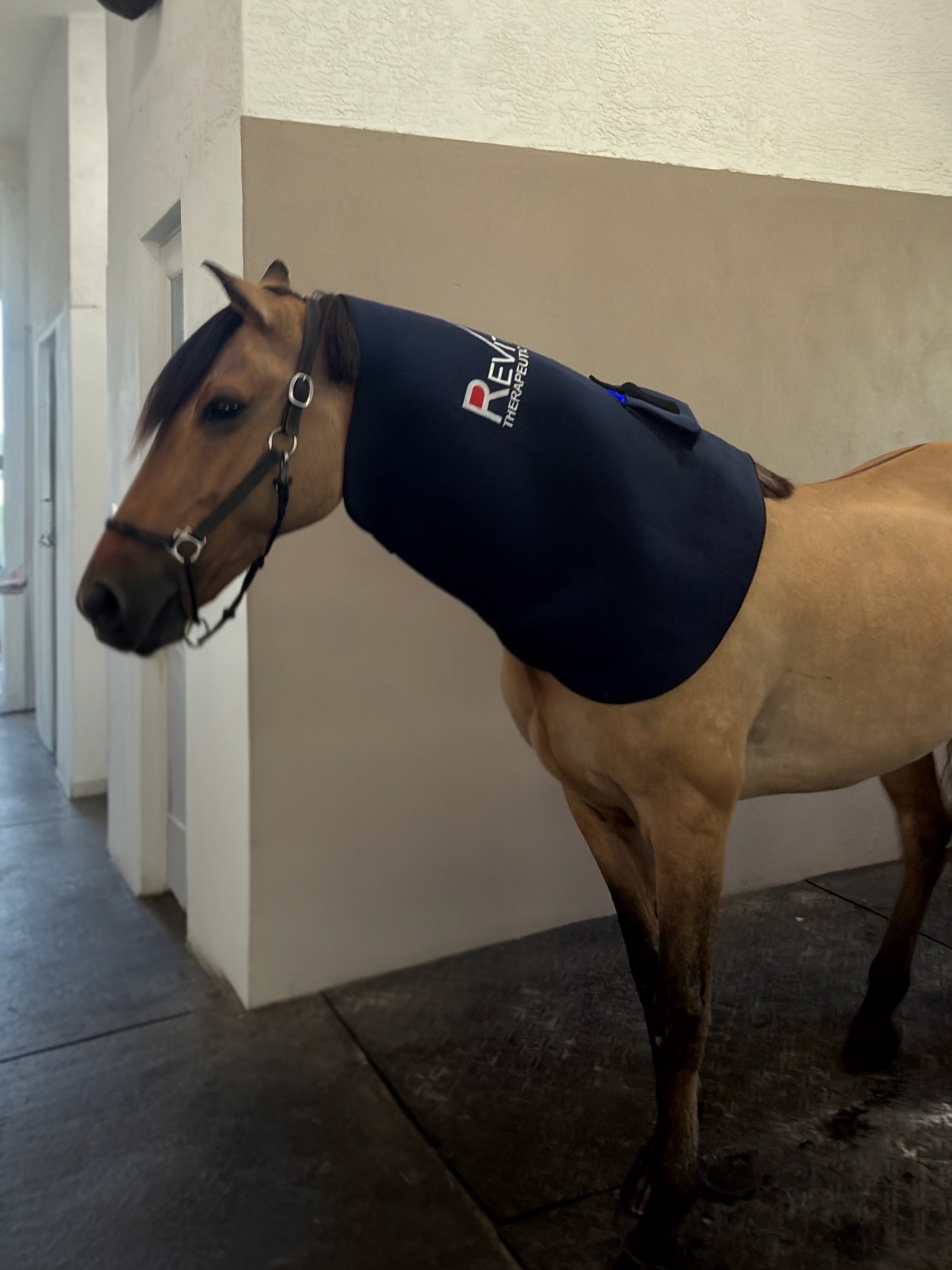Pre-sale Item Sale!! - We are proud to introduce the RevitaVet Therapy Neck Pad! Consisting of an alternating rows of visible and infrared LEDs, the Neck Pad is a must have for your therapeutic toolbox. With a built in auto-off function following your 20 min treatment, this may be easily used in conjustion with your RevitaVet Poll Cap, Get Ready therapy Blanket, and other RevitaVet therapy equipment!